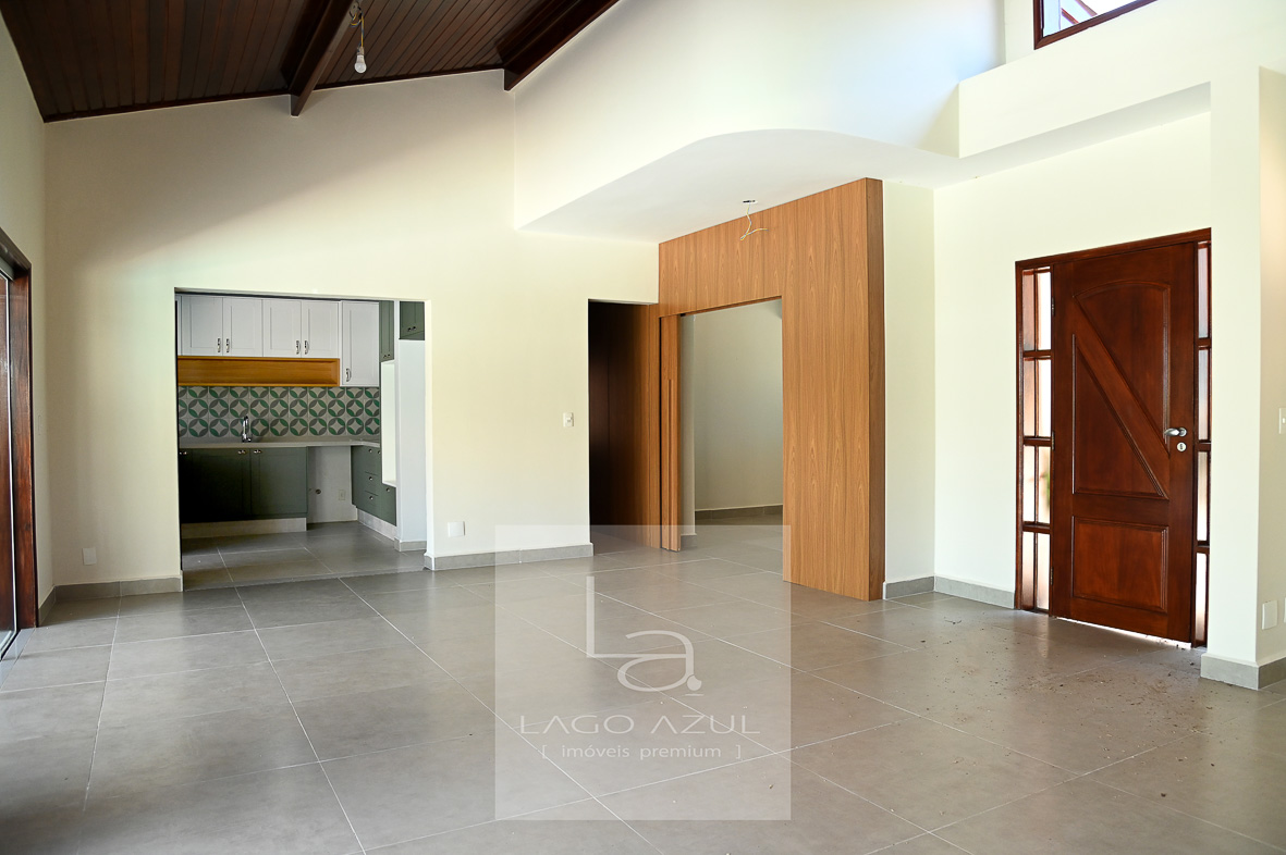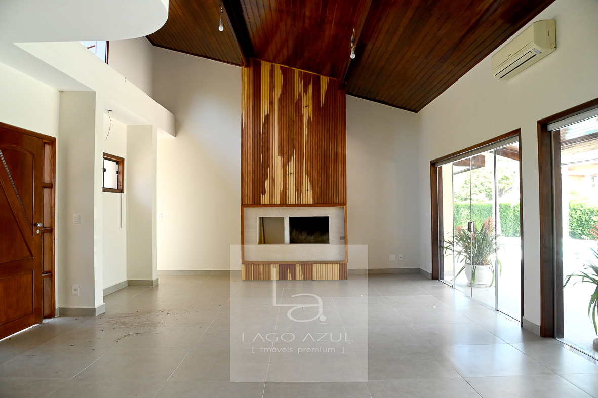 Sala ampla para dois ambientes, com pé-direito alto, lareira e integração total com a cozinha e a área de lazer, garantindo excelente circulação e convivência.