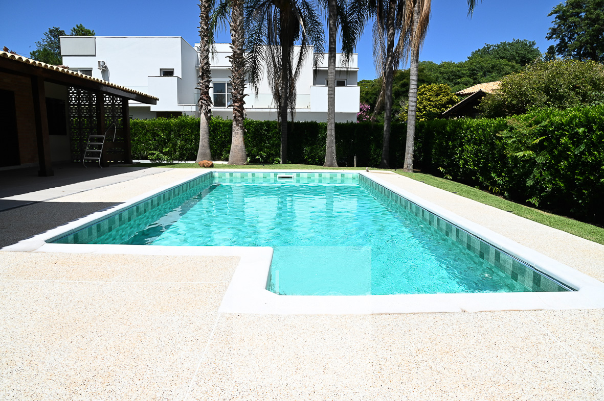 Piscina com vinil novo, banheiro externo e área gourmet integrada à cozinha por passa-prato, equipada com churrasqueira e amplo balcão em granito, perfeita para receber.