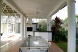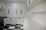 A cozinha conta com armários e uma excelente iluminação natural, conectando-se à área de serviço, que é coberta, possui armários e acesso ao jardim lateral. Na parte externa, há ainda um banheiro adicional com sauna.