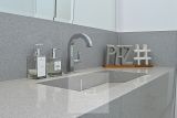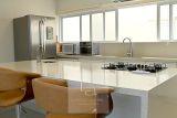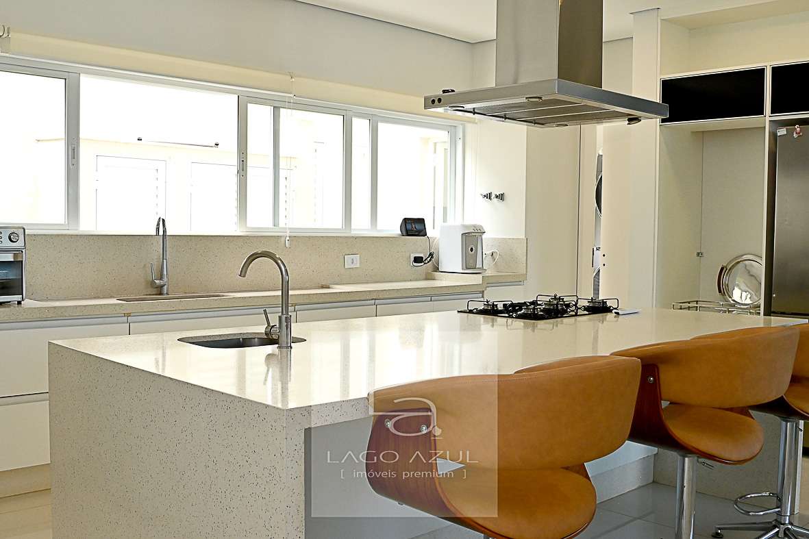 Cozinha moderna com ilha, equipada com fogão cooktop e torneira gourmet.