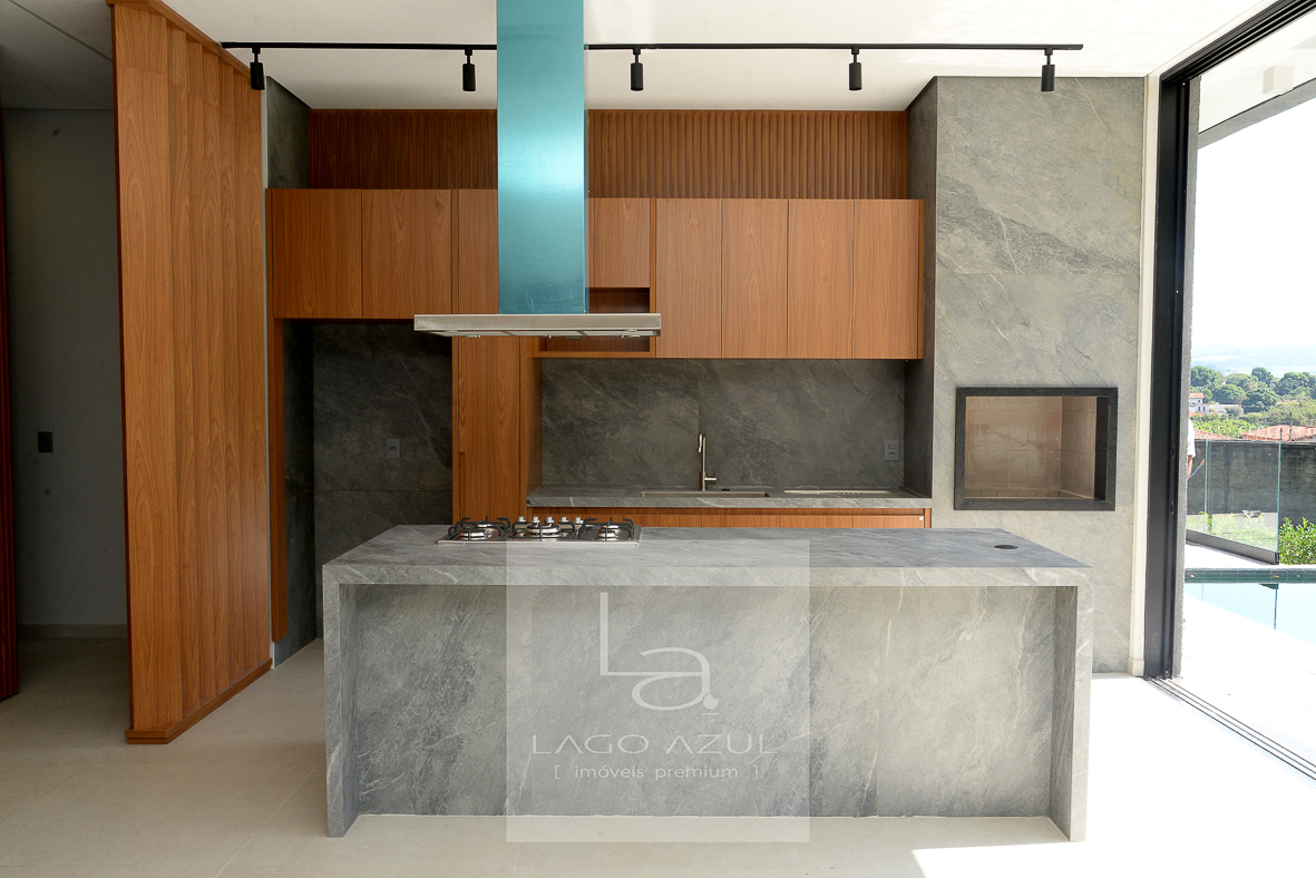 Ampla sala gourmet envidraçada dos dois lados, conjugada com a cozinha que tem bancada em porcelanato “tasca” da Porto Belo sem nenhuma emenda,fogão Cooktop e churrasqueira.