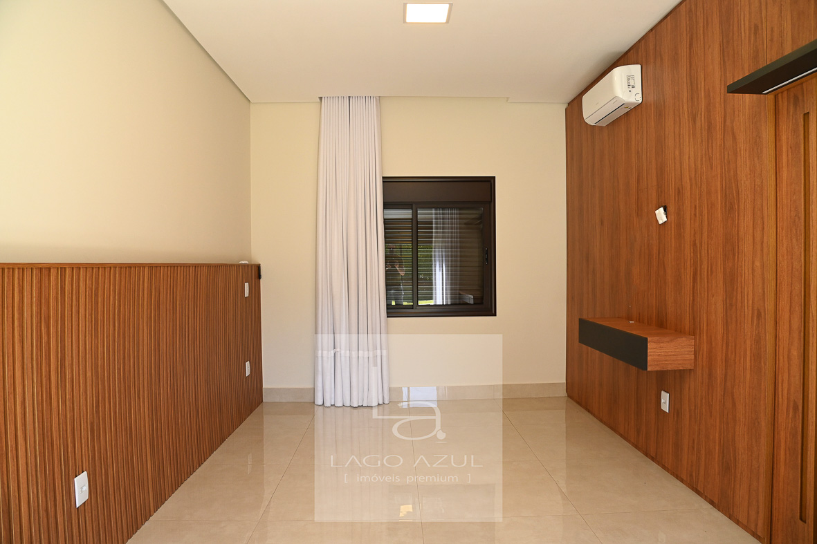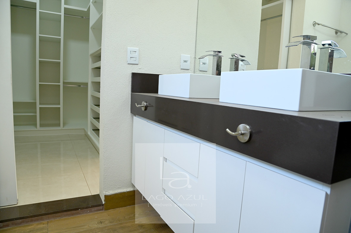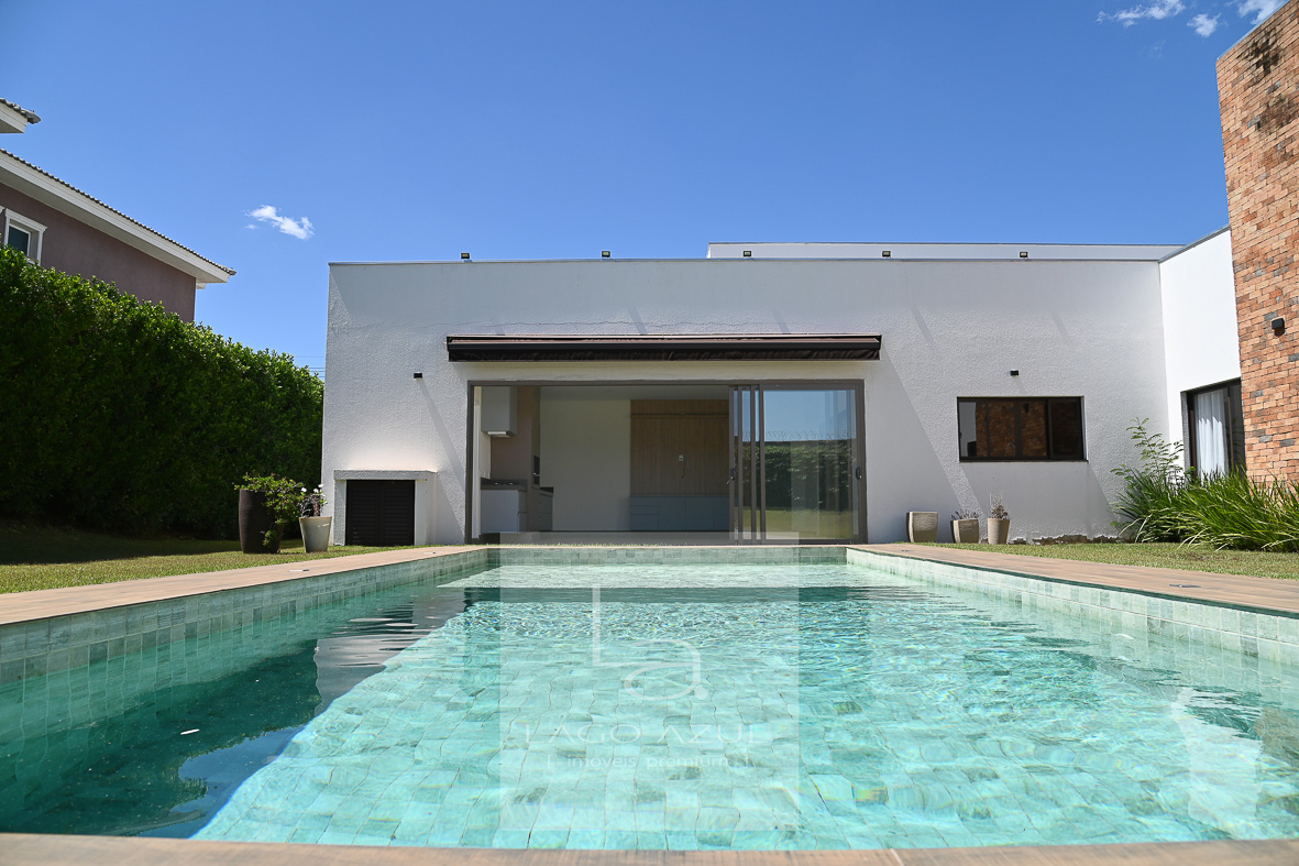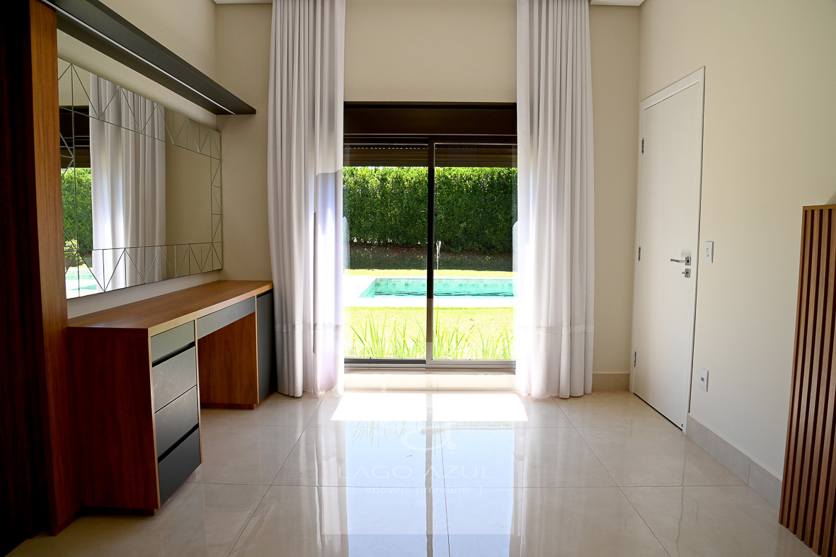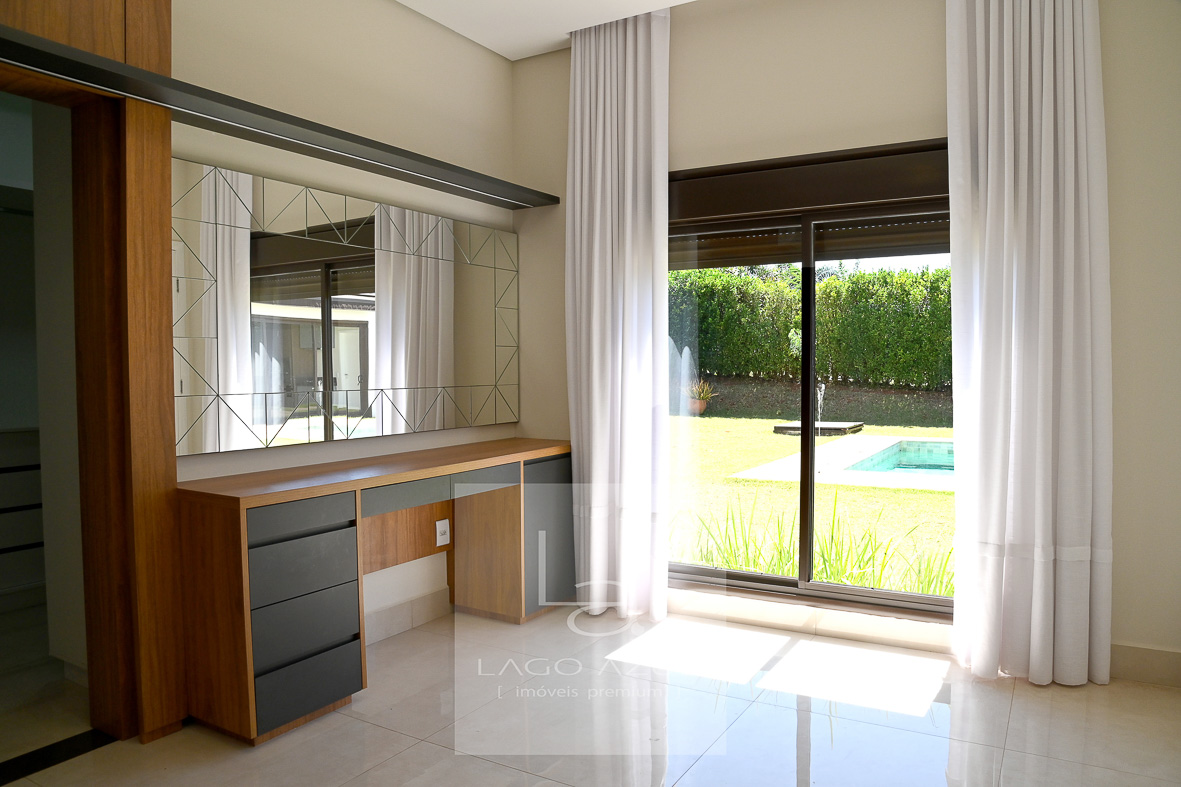 Casa possui:4 suítes, 3 delas com closet. A suíte Máster com porta balcão voltada para a piscina, com persianas em alumínio operada por controle remoto, ar condicionado, chuveiros e pias duplas, modulados no quarto e no closet, box em vidro temperado até o teto. As demais suítes também com ar condicionado, modulados no quarto e no closet (menos uma delas que não possui o closet), e box de vidro temperado até o teto. Todas elas também com persianas em alumínio operada por controle remoto. Sala de estar e sala de jantar com ar condicionado, pé direito duplo, integradas à cozinha, que possui modulados, balcão central e fogão cooktop, cozinha esta que que por sua vez também é integrada com as salas e com a área gourmet. Lavabo com modulados. Área gourmet, com armários, ponto de TV, pia, cooktop, banheiro de apoio e churrasqueira. A área gourmet é totalmente fechada em vidro, o que oferece praticidade e a oportunidade de ser utilizada independentemente do clima. A casa tem aquecimento solar, e no corredor tem um bom armário espelhado (tipo roupeiro), além de vários cômodos com cortinas. Piscina com prainha em azulejo, toldo solar, depósito e lavanderia com planejados. Garagem coberta para 3 carros e descoberta para mais 3.