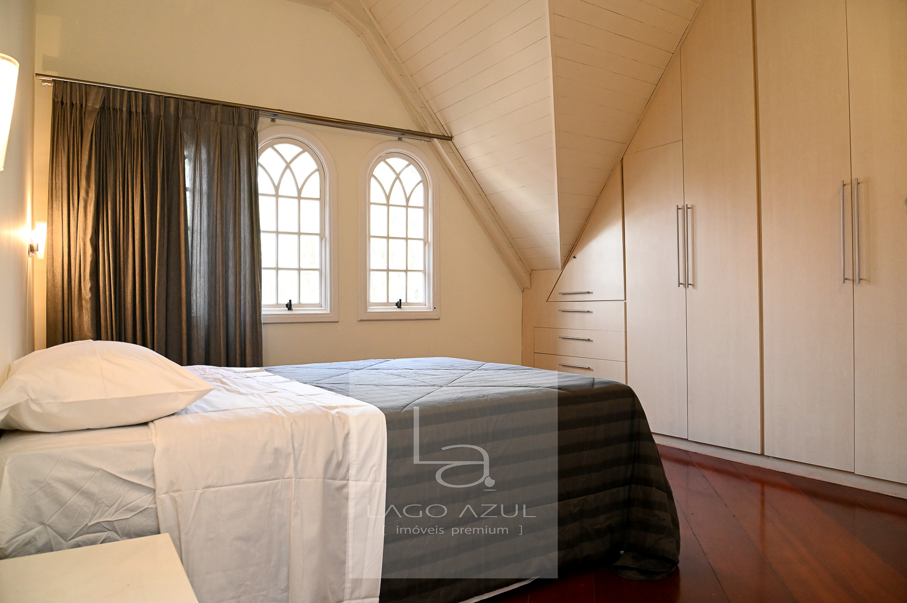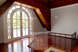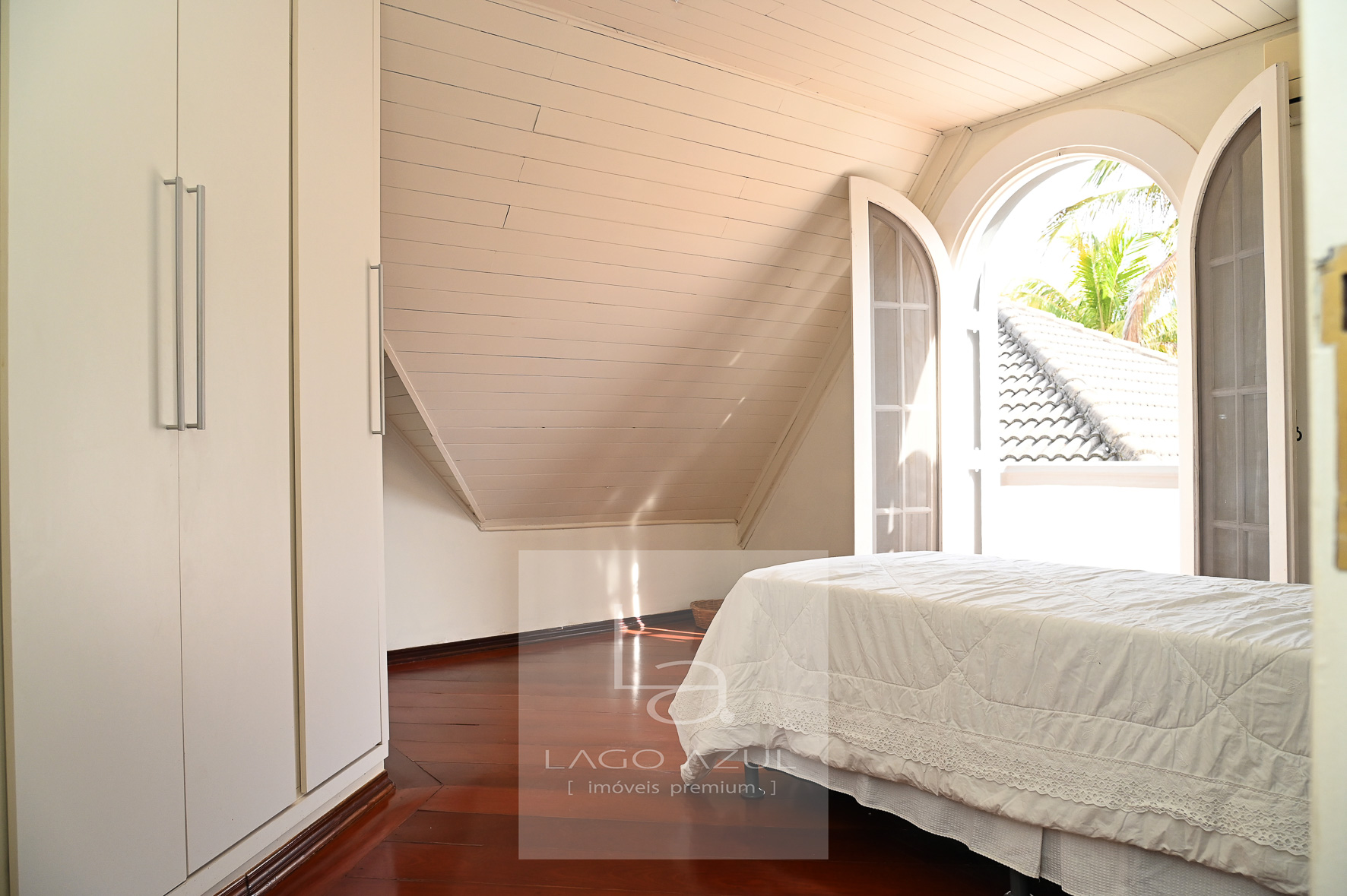 No piso superior, um hall com varanda frontal integrando os ambientes íntimos. São dois dormitórios de solteiro, ambos com varandas com vista para a piscina, atendidos por um banheiro com hidromassagem. A suíte principal possui um espaçoso closet, e o sótão abriga mais uma suíte, perfeita para ser usada como quarto extra, escritório ou espaço multiuso.