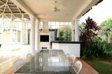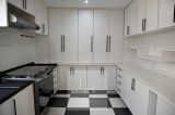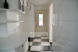 A cozinha conta com armários e uma excelente iluminação natural, conectando-se à área de serviço, que é coberta, possui armários e acesso ao jardim lateral. Na parte externa, há ainda um banheiro adicional com sauna.