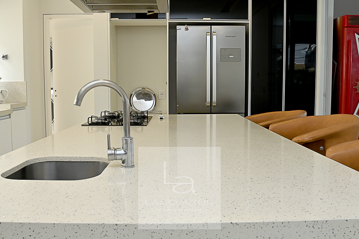 Cozinha moderna com ilha, equipada com fogão cooktop e torneira gourmet.